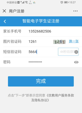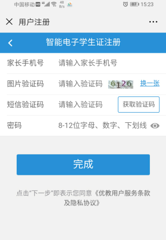 2.进入家长信息完善界面,如图1-5,填写需要的家长手机号、图片验证码、短信验证码、密码(8-12位字母、数字、下划线)如图1-6,点击“完成”