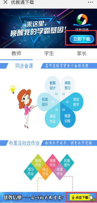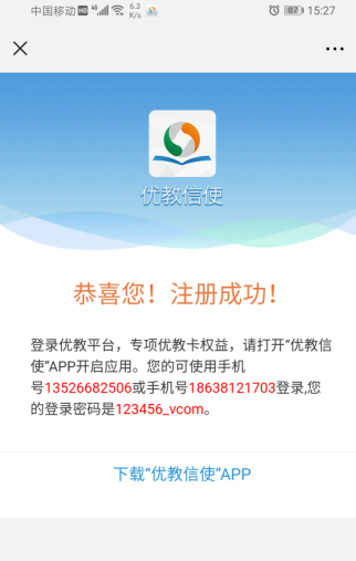 3.信息验证无误后,进入注册成功界面(此界面上提示登录优教信使APP的账号、密码),如图1-7,点击下方的下载“优教信使”APP,进入APP下载界面,点击右上方/右下方的立即下载按钮,如图1-8所示