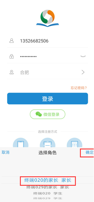 8.打开APP进入登录界面,可以通过输入账号、密码、选择区域信息,点击登录,在界面下方弹出角色选择栏,选择要登录的角色信息,点击确定,如图1-16,登录成功后进入优教信使APP首页。